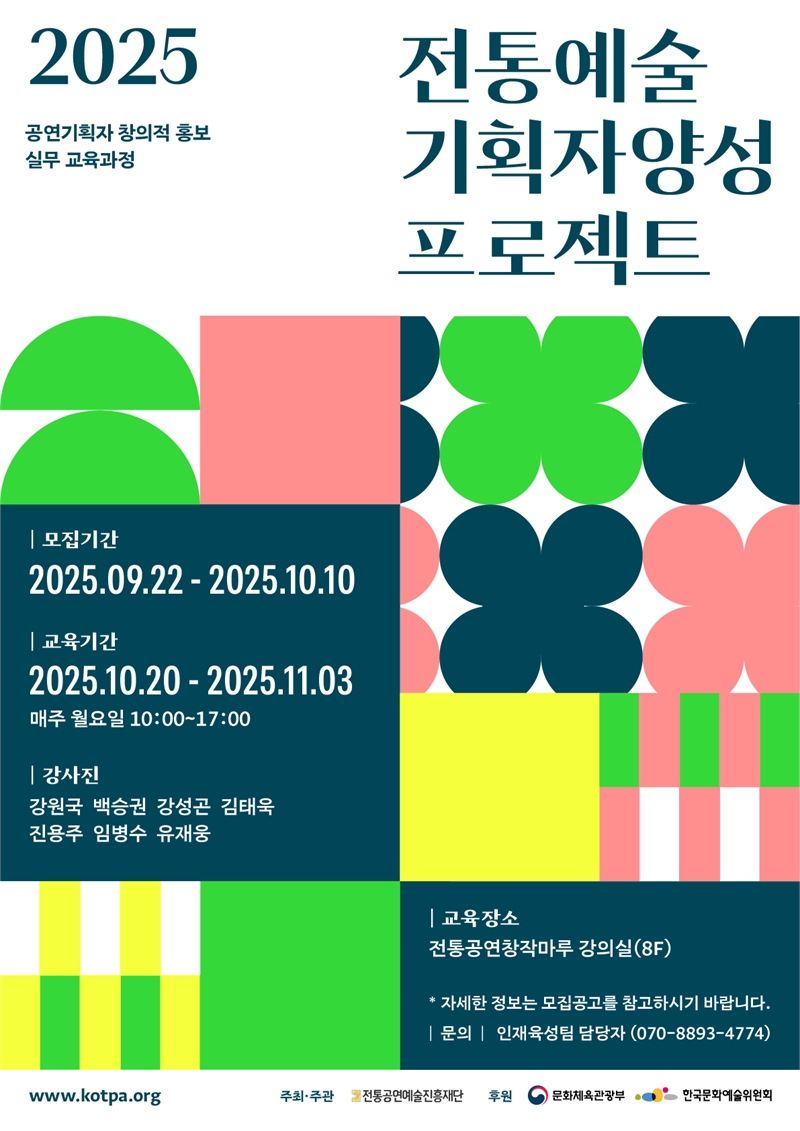 전통공연예술진흥재단(이사장 배영호)이 전통공연예술 분야의 전문 기획자를 양성하기 위한 ‘2025 전통예술 기획자 양성 프로젝트’ 하반기 프로그램 참가자를 9월 22일부터 10월 10일까지 모집한다.‘전통예술 기획자 양성 프로젝트’는 전통공연예술 분야의 공연 기획자 공급을 확대하고 역량을 강화하기 위해 2013년도부터 추