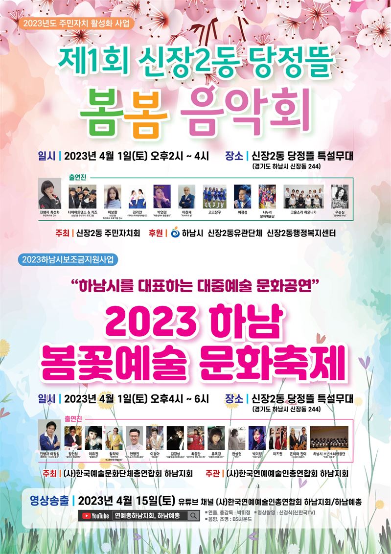 오는 2023년 4월 1일 토요일 오후 2시~6시 봄꽃향기 가득한 “당정뜰” 특설무대(경기도 하남시 신장동244)에서 (사)한국연예예술인총연합회 하남지회 의 2023년 하남 "봄꽃예술축제"와 신장 2동 주민자치회의 제1회 당절뜰 "봄봄 음악회"가 동시에 진행이 된다