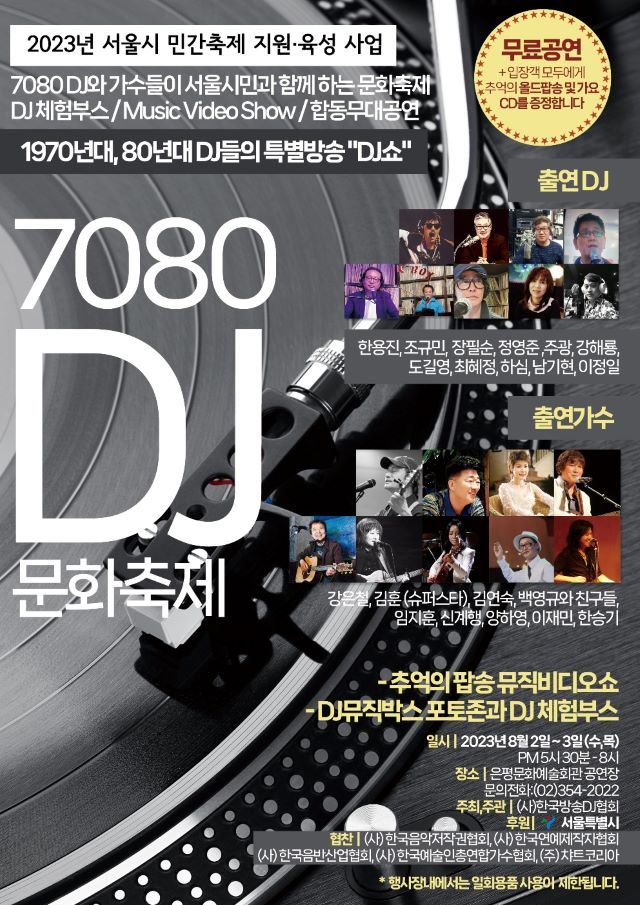 <7080 DJ 문화축제>는 2023년 서울시 민간축제 지원 육성사업으로 마련된 행사로 한국음악저작권협회와 한국음악실연자연합회가 협찬하고, 차트코리아 한국음반산업협회, 한국연예제작자협회, 한국가수협회가 후원하며 차트코리아가 유튜브를 통해 생방송으로 중계한다.