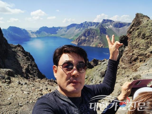 백두산 천지에서 셀카를 찍고 있는 가수 현준.