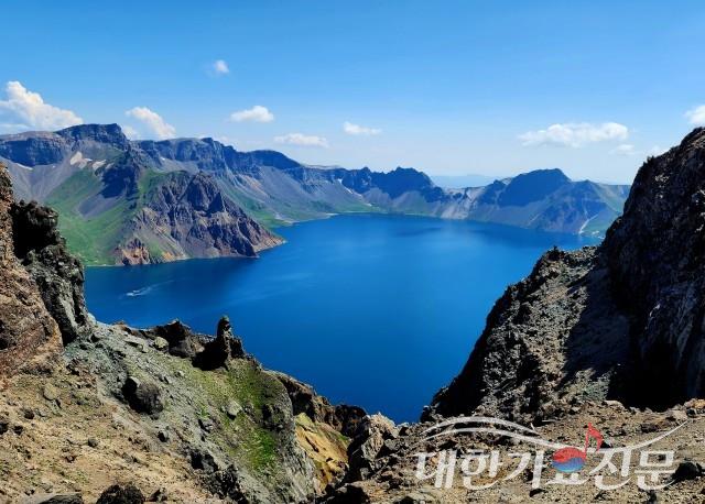 맑은 날씨에 모습을 드러낸 백두산 천지의 절경