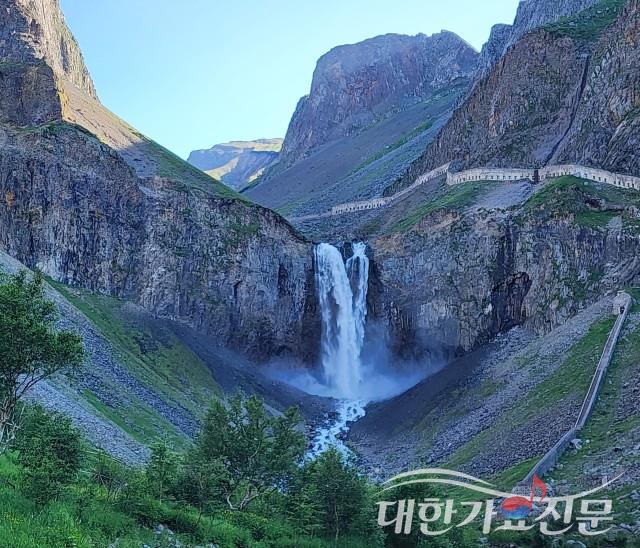백두산 천지에서 힘차게 흘러내리는 장백폭포(천지폭포).