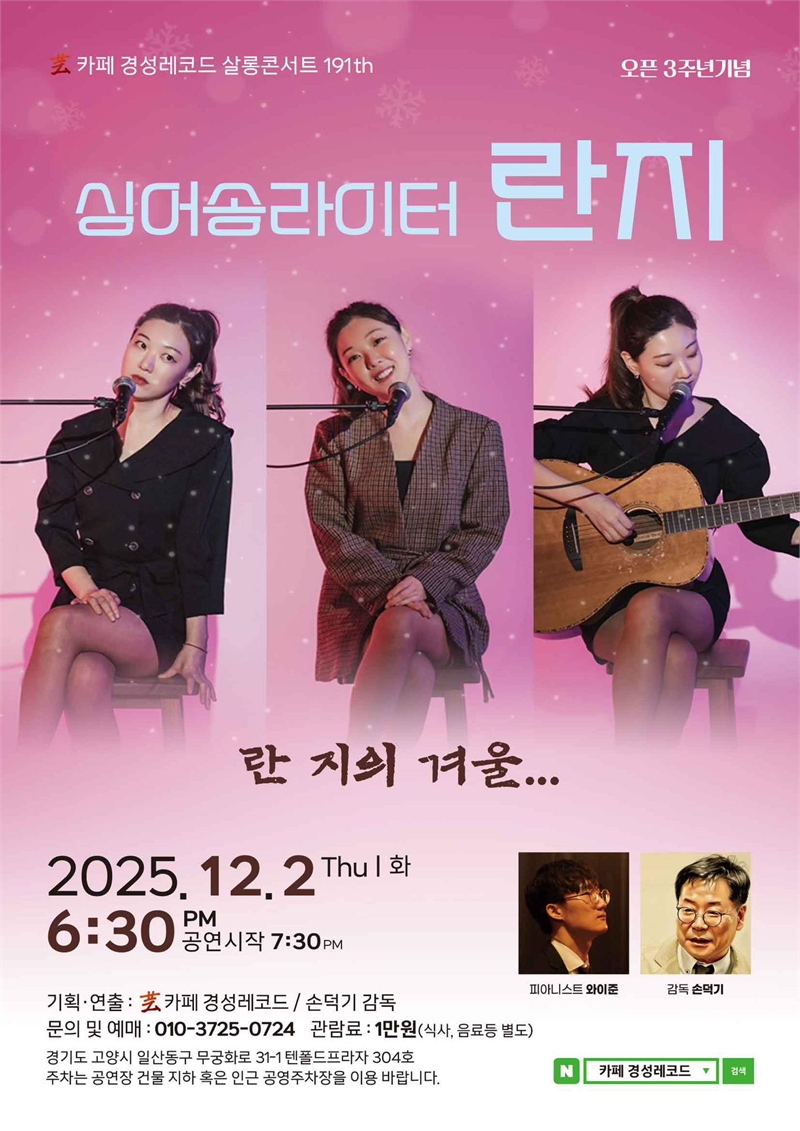 싱어송라이터 란지가 오는 12월 2일 경기 일산 소재 카페 경성레코드에서 겨울 테마 단독공연 ‘Ranzi’s Winter’를 개최한다. 이번 공연은 손덕기 감독 기획으로 진행되며, 재즈 피아니스트 와이준(YJoon)이 협연자로 참여, 어쿠스틱 기반의 라이브 셋으로 구성된다. 공연은 오후 6시 30분까지 입장 후 식사, 7시 30분 본 공연 시작으로 진행될 예정이다.